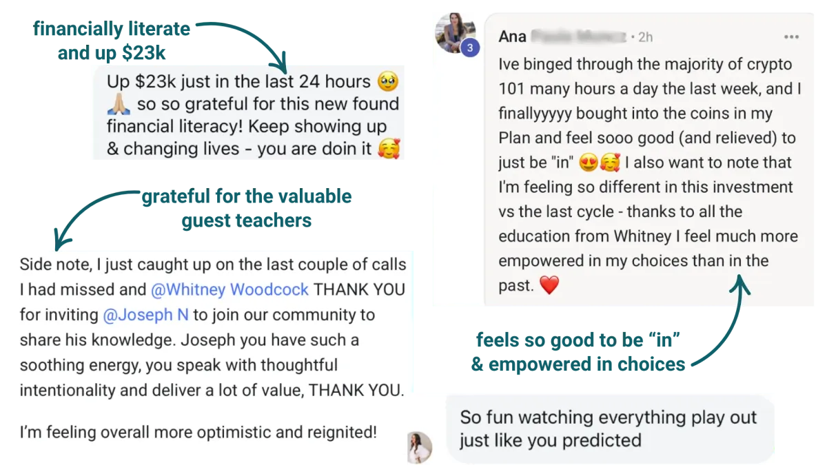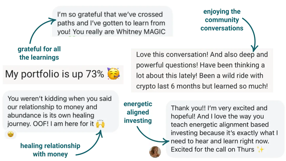 "Getting started in crypto felt overwhelming at first, but Whitney made it so approachable. She’s an amazing educator - super thoughtful in how she lays everything out... On a more energetic level, I just really appreciate the calm, grounded vibe that both Whitney and Joseph bring. They’re logical, data-driven, and genuinely excited about the space - but without any of the frantic, hype-y energy. My nervous system thanks them for that!"