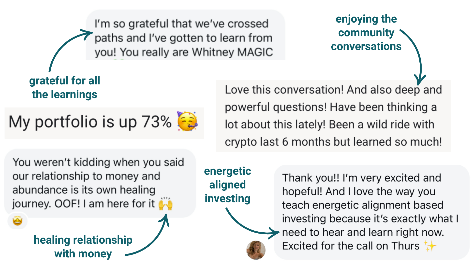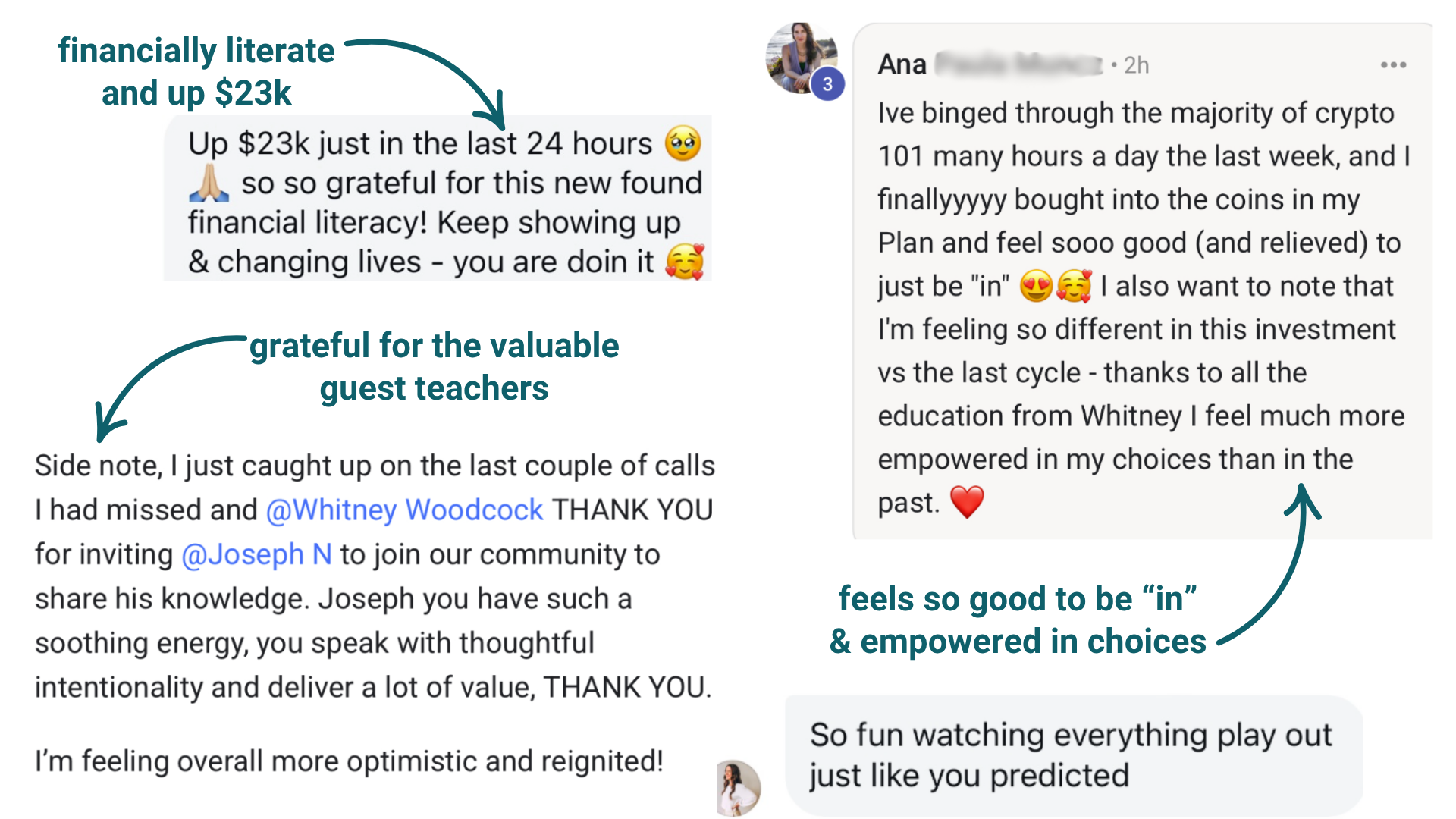 "Getting started in crypto felt overwhelming at first, but Whitney made it so approachable. She’s an amazing educator - super thoughtful in how she lays everything out... On a more energetic level, I just really appreciate the calm, grounded vibe that both Whitney and Joseph bring. They’re logical, data-driven, and genuinely excited about the space - but without any of the frantic, hype-y energy. My nervous system thanks them for that!"